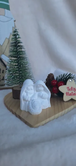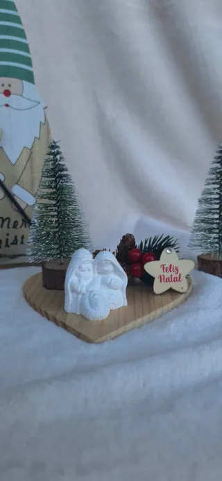 Conjunto de decoração de Natal com um presépio em miniatura, árvores e enfeites. - Inclui figuras do presépio, em pó cerâmico perfumado. - Enfeite em forma de estrela com a inscrição Feliz Natal.