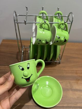 conjunto com 5 chávenas de café (falta uma) e 6 pratos com suporte marcas de uso assinaladas nas fotos