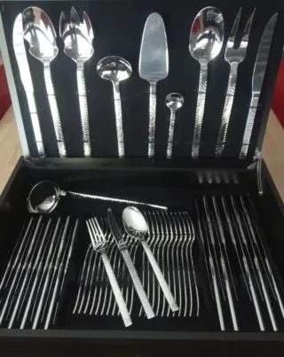 Conjunto de talheres Herdmar em estilo vintage, com 130 peças. - Design elegante e atemporal. - Acabamento polido. - Ideal para ocasiões especiais ou uso diário. - Faqueiro composto por: 12 facas de mesa 12 garfos de mesa 12 colheres de mesa 12 facas de sobremesa 12 garfos de sobremesa 12 colheres sobremesa 12 facas peixe 12 garfos peixe 12 colheres chá 12 colheres café 1 colher terrina 1 colher servir 1 colher molhos 1 pá bolo 1 faca trinchar carne 1 garfo trinchar carne 1 faca trinchar peixe 1 garfo trinchar peixe 1 talher salada