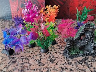 Conjunto de decorações vibrantes para aquário, trazendo cor e vida ao seu ambiente subaquático. - Plantas artificiais em tons de rosa, roxo, azul e laranja. (17 unidades) - Elemento decorativo em forma de rocha com detalhes verdes.