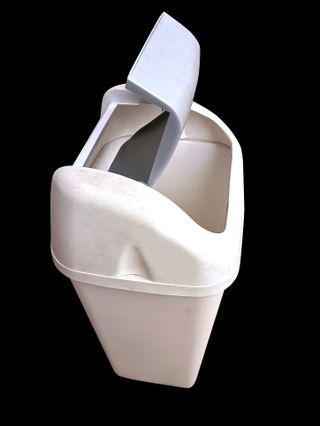 Balde de lixo de plástico branco e cinza com um design moderno e tampa basculante. Apesar de nunca ter sido usado, por ser grande, tem uma pequena rachadura no aro superior, como se pode ver nas fotos. Esta avaria não compromete a sua funcionalidade. Medidas: 27 largura x 20 profundidade x 60 altura