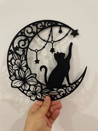 Quadro- silhueta de gato na lua florida. Nunca usado. Silhueta de gato para colocar na parede.Sem necessidade de pregos.Fita cola Dupla face dá para colar. Impressão 3D. Medidas aproximadas. (L) 22 * (A) 22 O valor não está negociável.