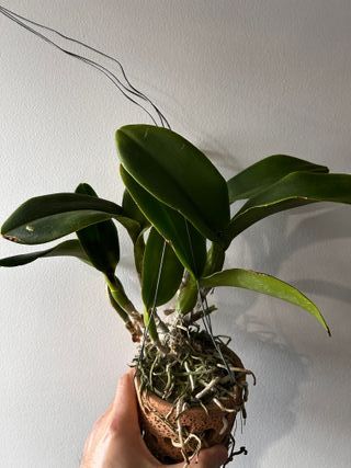 Linda orquídea Cattleya Nell Hammer de coleção em vaso de barro com suporte pendurar - Flores grandes - sem flor de momento.