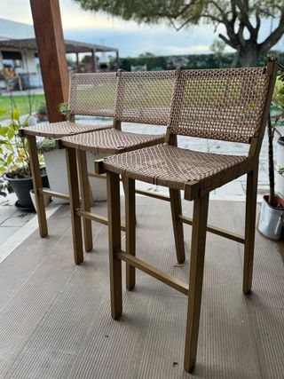 3 Bancos altos 75 cm em vime sintético Ori da Sklum. Vendo porque são altos demais para o meu balcão, nunca cheguei a trocar, mas não usei. Banco robusto, mas muito leve. Fabricado em estrutura de alumínio com acabamento a imitar madeira. Tem assento e encosto largos que o tornam um banco confortável, além disso, são confeccionados com trançado de vime sintético, conferindo-lhe resistênci e durabilidade. Medidas totais nas fotos.