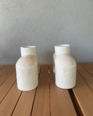 Conjunto de duas jarras em cerâmica com um design único e moderno. Perfeitas para adicionar um toque de elegância a qualquer espaço. - Cor: branco cru - Material: cerâmica