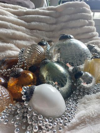Conjunto vintage de bolas de Natal com um design craquelado único, perfeitas para adicionar um toque de brilho à sua árvore. Fosco e brilhante, grande e pequeno, agrupados para formar um todo colorido e sofisticado cheio de glamour! - Acabamento em vidro com efeito craquelado. - Cores douradas e prateadas que combinam com qualquer decoração. - Detalhes que refletem a luz de forma encantadora. Guirlanda de contas de plástico de 2 x 4 m 1 bola de vidro prateado e craquelado tamanho XL 17 bolas de vidro de tamanhos e formatos diferentes, muitas com efeito craquelado. Origem: Austria Ano: 1960