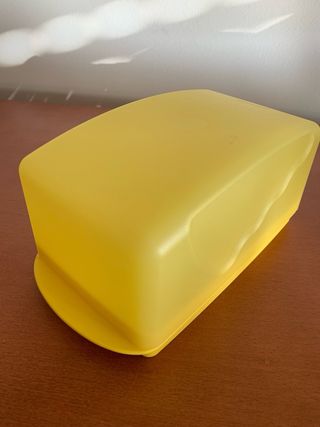 Manteigueira da marca Tupperware em plástico. - Cor amarela vibrante. - Design clássico e funcional.
