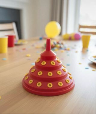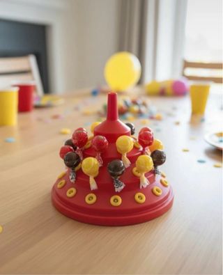 Suporte divertido para organizar e exibir chupa-chups em festas ou eventos. Com um design em camadas, permite acomodar vários doces de forma atrativa. - Base com anéis decorativos. - Estrutura em forma de funil.