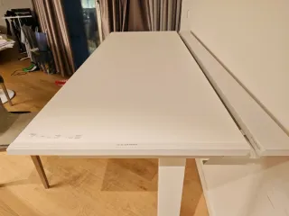 Mesa prática com abas laterais extensíveis. - Material: madeira e ferro - Cor: Bege e branco
