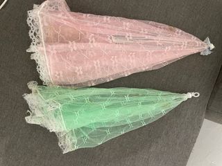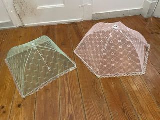 Conjunto de dois protetores de comida em rede. Ideal para usar no exterior e manter os insectos afastados da comida. As duas proteções estão manchadas e precisam de ser lavadas, manchas estão visíveis nas fotos. Entrego em mão em Lisboa.