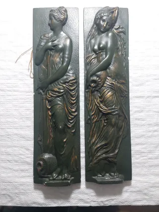 Conjunto de dois quadros decorativos com figuras femininas em relevo. - Design clássico. - Acabamento em tons de verde e dourado. - Material: gesso