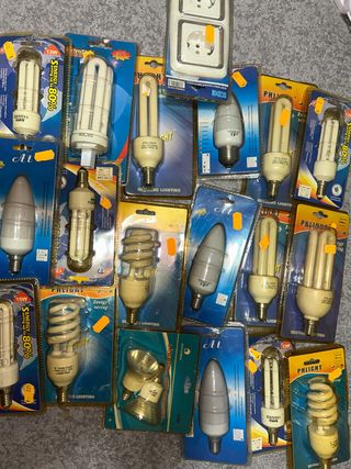 Conjunto de lâmpadas variadas, ideais para diferentes necessidades de iluminação. - Lâmpadas fluorescentes compactas. - Lâmpadas tipo vela. - Lâmpadas de halogéneo. - Lâmpadas em espiral. Modelos sortido