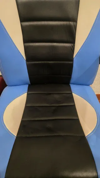 Cadeira gamer com design moderno e confortável. - Revestimento em couro sintético. - Detalhes em azul e branco.
