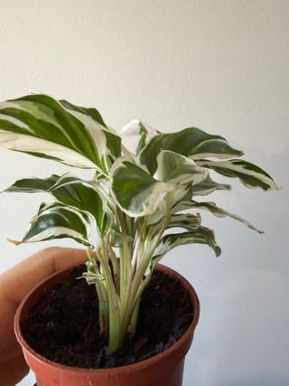 Planta Calathea White Fusion, conocida por sus hojas únicas. - Hojas con un patrón distintivo de verde y blanco.