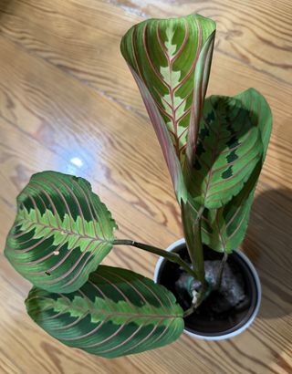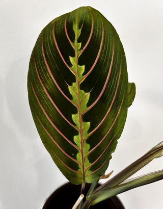 Planta Maranta Fascinator com folhas de tons verdes e nervuras vermelhas.