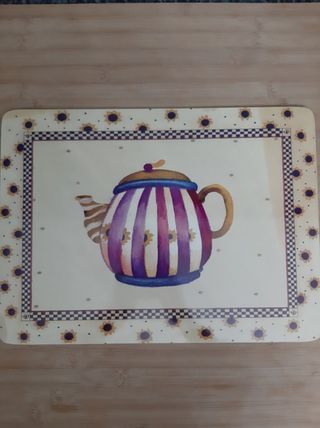 Conjunto de quatro individuais com um design encantador de bules e girassóis. - Feitos de cartão rígido e cortiça. - Borda decorada com padrão xadrez e girassóis. - Imagens de bules em tons de roxo e amarelo.