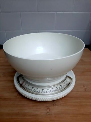 Balança de cozinha com taça, ideal para pesar ingredientes. - Taça em plástico. - Base em plástico branco. - não funciona a pilhas - Para acertar as gramas basta rodar a roda de cima - Pesa até 2.2 kg - Pode ser guardada dentro da taça ocupando pouco espaço