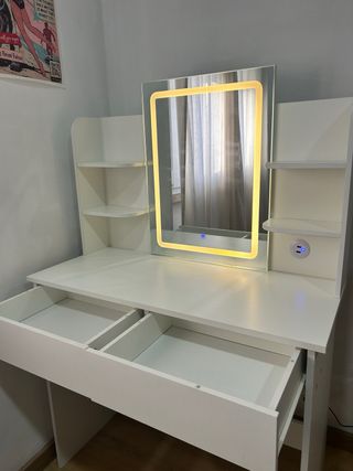 Toucador branco com design moderno e minimalista, equipado com espelho LED integrado com controlo tátil. Possui iluminação ajustável, várias prateleiras laterais para organização de cosméticos ou acessórios e uma gaveta ampla para arrumação. Inclui ainda tomada integrada, prática para secador, alisador ou carregamento de dispositivos. Estrutura robusta e fácil de combinar com qualquer decoração. Usado, mas em excelente estado. Largura 90, altura 135, com espelho
