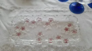Travessa em vidro com um delicado padrão de flores. - Design com motivos florais em relevo. - Detalhes em rosa nas flores.