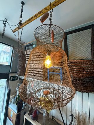 Candeeiro de tecto frito apartir de uma antiga armadilha de pesca. Possibilidade de envio atravésda plataforma Wallapop.