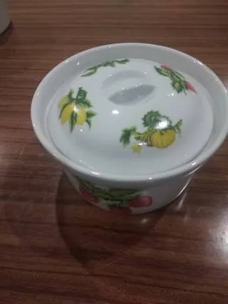 Panela em cerâmica com um lindo design decorado com frutas. - Tampa com puxador. - Motivos de morangos e outras frutas. - Acabamento branco com detalhes coloridos.