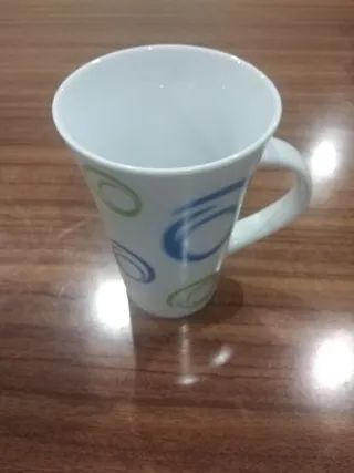 Caneca em porcelana com um design moderno e elegante. - Padrão com círculos e linhas em tons de amarelo, verde e azul. - Alça confortável para segurar.
