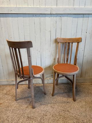 Conjunto de duas cadeiras estilo bistro, com um toque vintage. - Estrutura em madeira. - Assento em tecido tipo Alcântara na cor laranja.