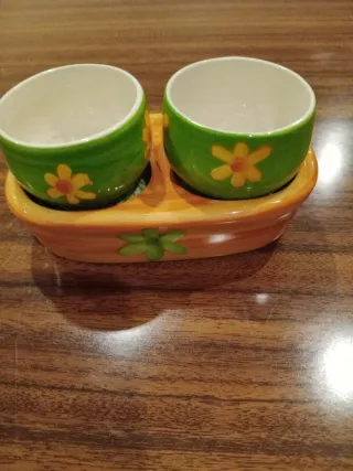 Conjunto de suporte para ovos com um design alegre e decorativo. - Peça em cerâmica com acabamento esmaltado. - Motivo de flores pintadas à mão. - Base retangular com dois encaixes para ovos.