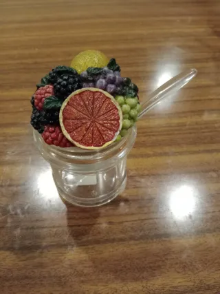 Açucareiro em acrílico com um topo decorativo em forma de frutas. - Design vibrante com diversas frutas. - Transparente com detalhes coloridos.