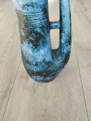 Jarra decorativa em cerâmica azul ( 1950 ) do ceramista francês Jacques Blin. A jarra é de um azul suave com o esmalte enevoado. Está decorada com um friso de pássaros e arbustos estilizados na parte inferior do corpo e um padrão linear repetitivo na parte superior do gargalo. Uma peça zoomórfica extremamente rara de Blin. Em muito bom estado de conservação geral. Assinatura: "J. Blin"