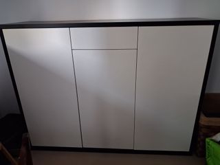 Móvel elegante com design moderno, ideal para organizar sapatos. - Acabamento em preto e branco. - Portas com linhas retas e minimalistas. - Gaveta superior discreta.