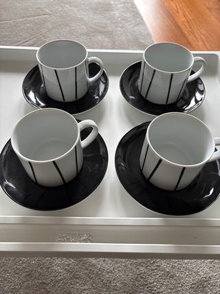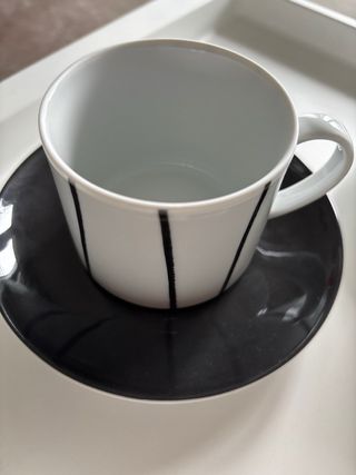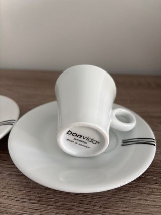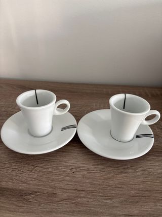 Conjunto de duas chávenas de café novas. - Design moderno com detalhes em preto. - Perfeitas para um café expresso.