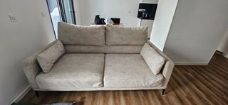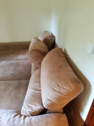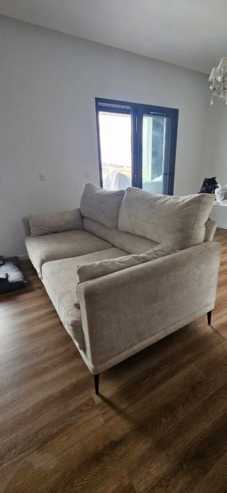Sofá confortável em tecido bege com chaise longa. - Design moderno e elegante. - Assentos espaçosos e ajustável. - Almofada da cabeça ajustável. - Espaço para armazenar no chaise. - Ideal para relaxar. Medidas aproximada: 270cm x 82cm x 140 | o chaise tem 140cm