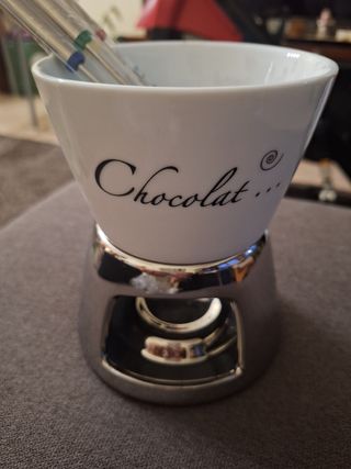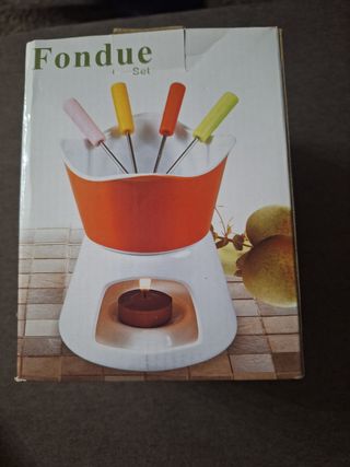 Conjunto de fondue com um design moderno e elegante. - Tigela em laranja vibrante. - Base branca. - Inclui 4 espetos coloridos.
