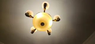 Candeeiro de teto com um design elegante. - Estrutura em metal. - Detalhes em vidro. - Cor preta com acabamentos amarelos.