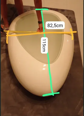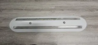 Lâmpada fluorescente com um design oval e acabamento branco. Possui duas aberturas para iluminação. - Formato oval. - Detalhes em metal. - Acabamento liso.