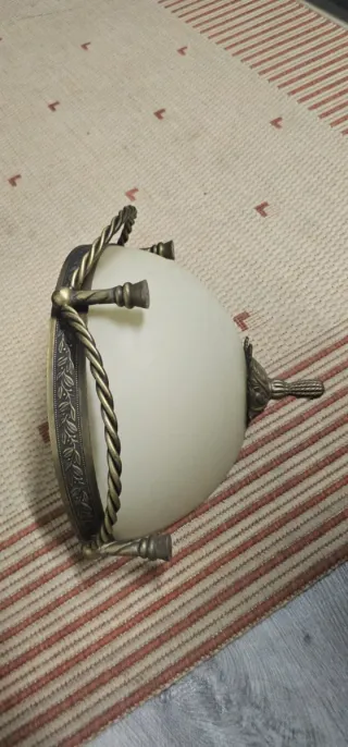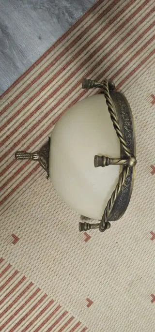 Candeeiro de teto com um design elegante. - Acabamento em dourado e bege. - Detalhes em vidro. - Estrutura em metal.