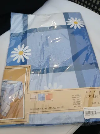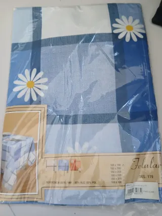 Toalha de mesa com padrão xadrez em tons de azul e branco, decorada com margaridas. ✅️ Nova. Embalagem fechada. - Dimensões : 160x160 cm - Composição: 50% Algodão, 50% Poliéster.