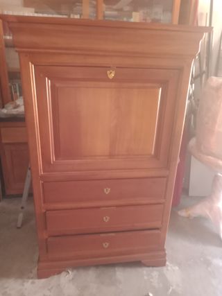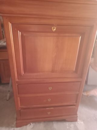 Escrivaninha em madeira, com um design clássico e elegante. - Acabamento em tom castanho. - Detalhe de fecho em dourado na parte superior. - Três gavetas com puxadores dourados. - Seis pequenas gavetas no interior