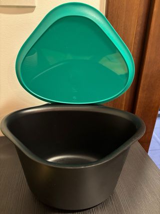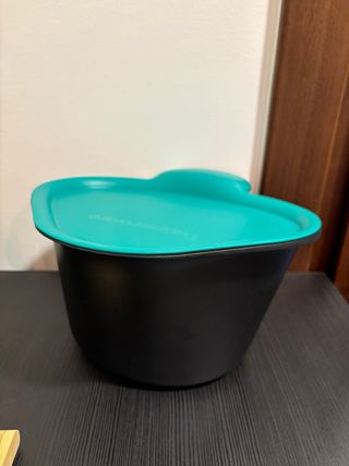 Recipiente da marca Tupperware em plástico. - Cor preta com tampa verde - Design moderno e prático.