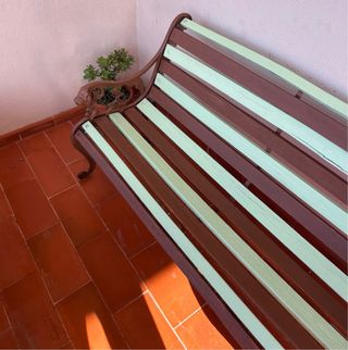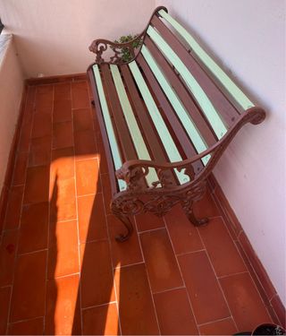 Banco de jardim com estrutura em ferro forjado e assento em madeira. - Design clássico e elegante. - Combinação de cores harmoniosa.