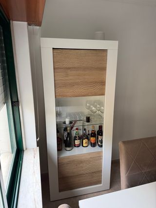 Conjunto de móveis para sala de jantar, com design moderno e elegante. Móvel de TV 1 porta cor branco/madeira Aparador 4 portas em branco/madeira Vitrine branca/ madeira com estante de vidro Mesa de jantar extensível branco 6 cadeiras cor beje Espelho