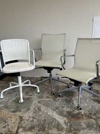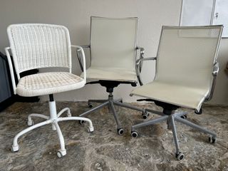 Conjunto de três cadeiras versáteis, ideais para escritório ou quarto. - Uma cadeira com assento e encosto em vime. - Duas cadeiras com assento e encosto em malha. - Base com rodízios para fácil mobilidade.