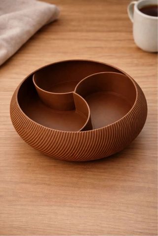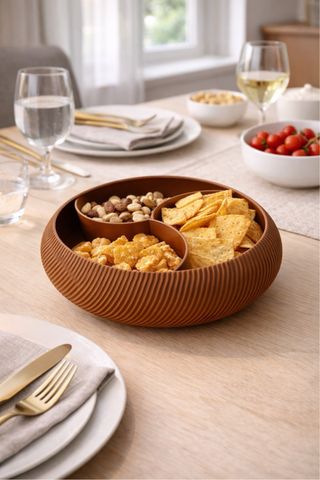 Este bowl não é apenas decorativo, é a solução perfeita para quem ama organização com estilo! Com um design moderno e textura canelada, ele adapta-se a qualquer ambiente da casa. 🌟 Por que vais adorar? • Design Inteligente: Possui 3 compartimentos internos em formato espiral que mantêm tudo separado e organizado. • Multifuncional: • Na Cozinha: Perfeito para servir snacks, frutos secos ou doces sem misturar sabores. • No Quarto/Casa de Banho: Excelente organizador de elásticos de cabelo, presilhas e grampos, mantendo os teus acessórios sempre à mão e sem confusão. • Estética Clean: Em tom castanho terracota, combina com decorações