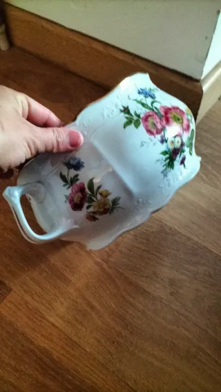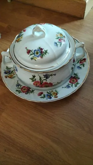 Sopeira em porcelana da marca Disfer, com um delicado padrão floral e detalhes em dourado. - Design clássico com flores coloridas. - Acabamento em dourado na borda e alças. - Peça elegante para a sua mesa.