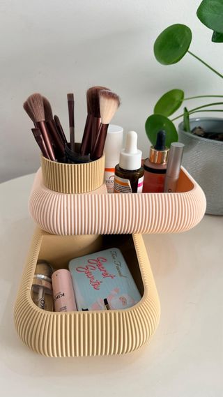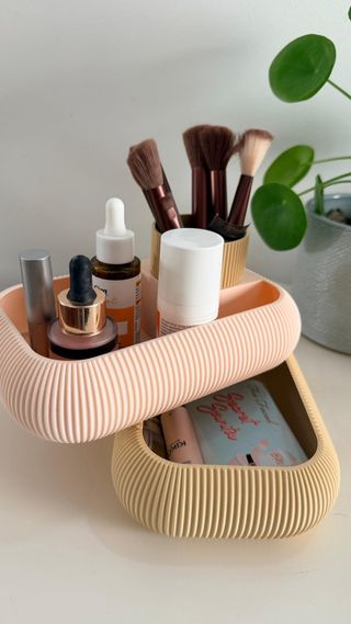 Dê um toque sofisticado à sua penteadeira ou casa de banho com este organizador de design moderno e minimalista. Padrão com paredes estriadas – visual elegante, maior durabilidade e fácil de limpar Design rotativo prático – acesso rápido e cómodo aos seus produtos 2 compartimentos retangulares (210 × 130 × 50 mm cada) – ideais para maquilhagem, cremes e acessórios 1 compartimento redondo vertical (68 × 68 × 130 mm) – perfeito para pincéis, máscaras de pestanas ou batons Montagem simples e rápida – basta empilhar os níveis e enroscar o compartimento redondo Não necessita de peças extra Produto novo, nunca usado