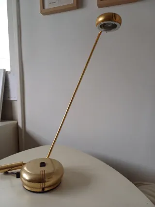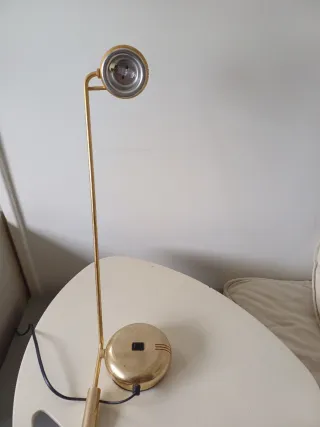 Candeeiro de mesa com um design elegante e moderno. A sua cor dourada confere um toque de sofisticação a qualquer espaço. Altura máxima 52 cm e diâmetro da base 13 cm. - Base redonda e robusta. - Haste fina e inclinada. - Cabeça do candeeiro esférica.