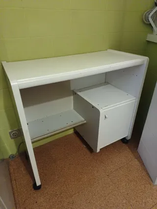 Secretária madeira branca, em bom estado. - Estrutura em madeira. - Gaveta para arrumação. - Pés com rodas para fácil movimentação.