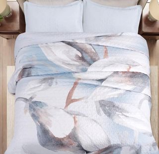 Conjunto colcha de solteiro com estampa floral em tons de cinza e branco. - A colcha possui um design elegante e delicado. - Inclui uma fronha. - Ideal para quem busca conforto e estilo na decoração do quarto.