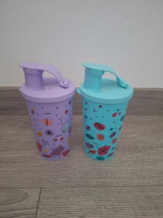 Dois copos adoráveis da Tupperware, da linha Copacabana. Lindos e em ótimo estado! 330 ml cada, perfeitos para levares para a praia ou para um piquenique. Tem tampa com bocal prático para beber - Perfeitos para levar suas bebidas para todo lugar. - Design charmoso com temática praiana.